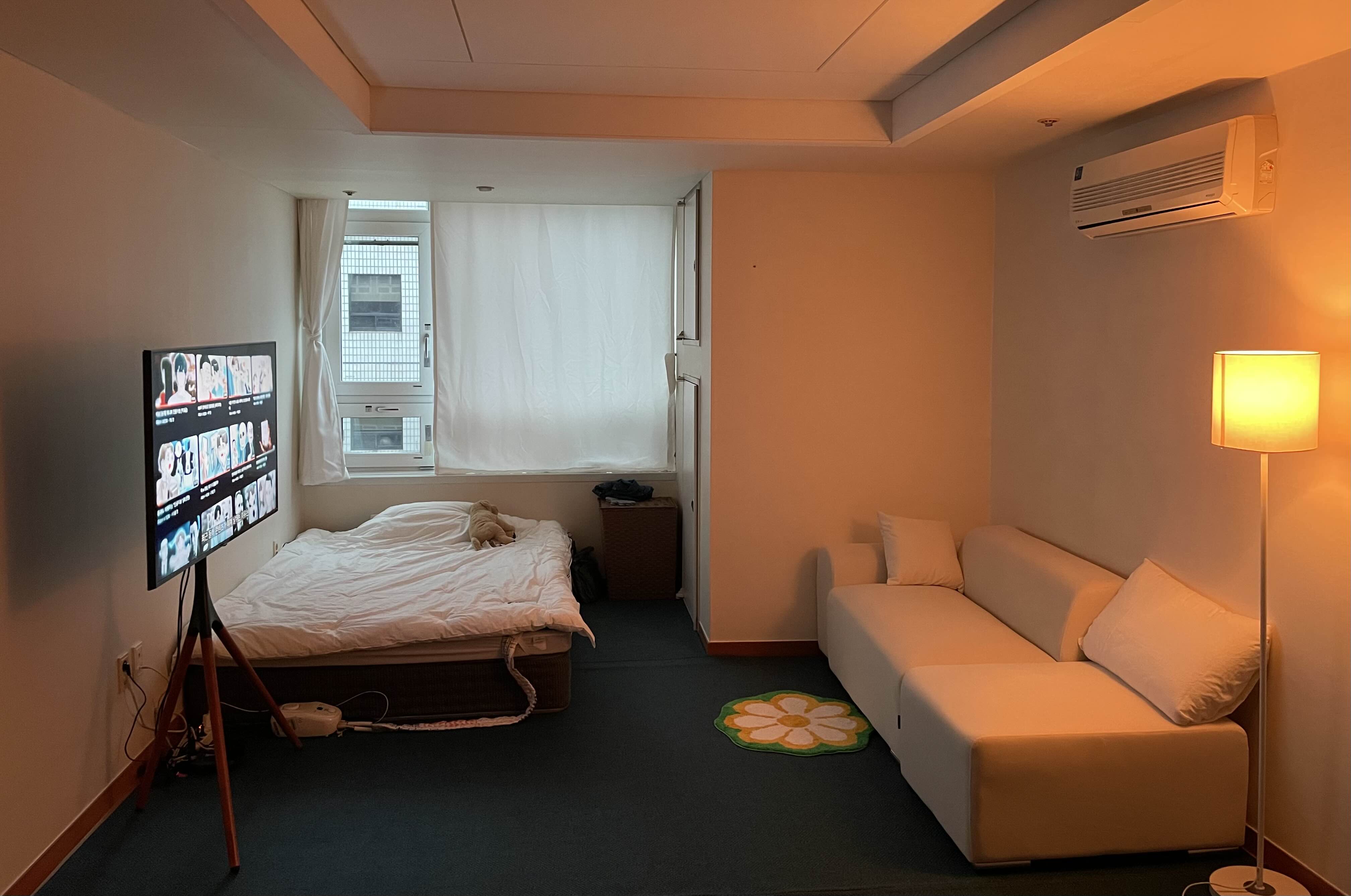 커튼치고 살아야 함. 근데 나름 어둡고 수면실 인테리어해서 괜찮았음. 커튼열면 아주머니들과 눈마주침. 18시 이후 퇴근해서 소등